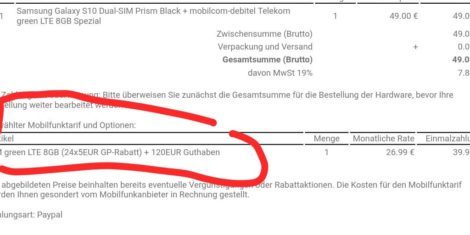 Nur mal kurz ein eigener Deal für das Samsung Galaxy S10, das ja sicherlich einige auf der Wunschliste haben: Bei Saturn gibt es den derzeit günstigsten Vertrag mit unter 30€ im Monat und satten 6GB LTE im Telekom- bzw. Vodafone-Netz! Zum Vergleich bekommt man zwar das Samsung Galaxy S10e sogar eff. kostenlos, aber das normale Galaxy S10 dagegen ist eben noch recht teurer. Insofern könnt ihr hier zum Bestpreis zuschlagen, wenn ihr noch auf der Suche seid: