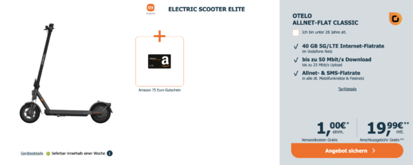 Xiaomi E-Scooter Elite 🛴 für 1€ mit 40GB 5G/LTE Vodafone Allnet für 19,99€ mtl. + 75€ Amazon.de Gutschein, 10€ Bonus & AG Gratis!