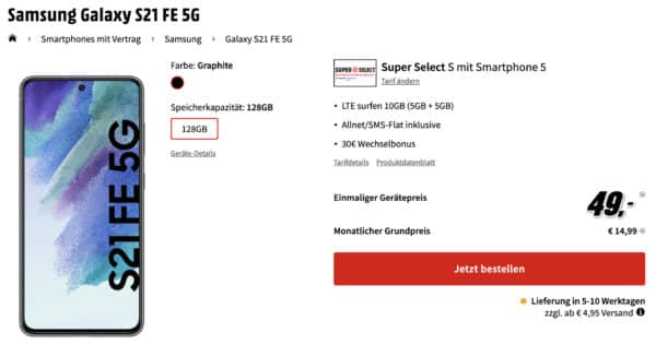 MediaMarkt liefert grade den nächsten Deal für den Super Select S: Ihr bekommt das Samsung Galaxy S21 FE (128GB) für einmalig nur noch 49€ mit einer 10GB LTE Allnet-Flat für 14,99€ im Monat. Wenn ihr alle Kosten berücksichtigt, bekommt ihr das Smartphone sozusagen fast kostenlos dazu. Das kann sich durchaus sehen lassen:- Tarif eff. 0,61€ mtl.!