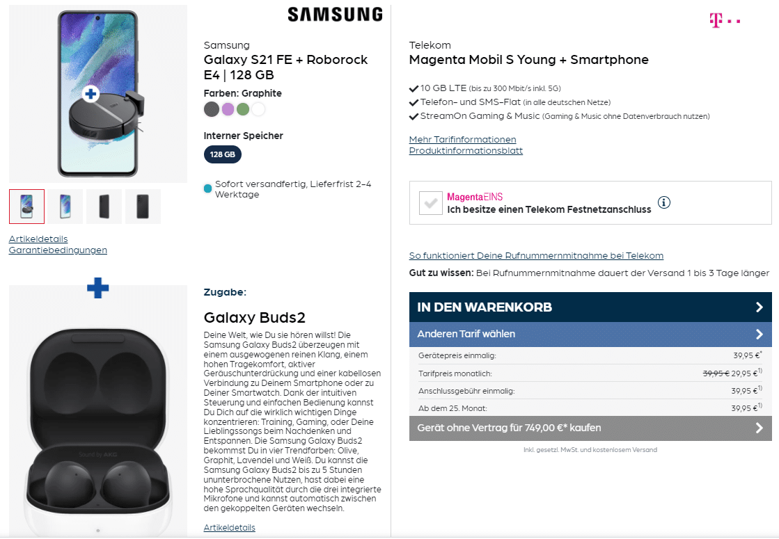 Ihr bekommt einen originalen Telekom Magenta Mobil S Young Tarif mit 10GB LTE / 5G Datenvolumen und einer Surf-Geschwindigkeit von bis zu 300 Mbit/s. Zudem könnt ihr so viel telefonieren und simsen wie ihr wollt. Hinzu kommt kostenloses StreamOn für Musik und Gaming. Obendrauf gibts das brandneue Samsung Galaxy S21 FE 5G, sowie zwei fette gratis Zugaben: Den Robrock E4 Saugroboter (im Wert von fast 200€), sowie die Galaxy Buds 2 Kopfhörer (im Wert von 95€)! Die Grundgebühr beträgt für alles zusammen gerade mal 29,95€ im Monat und für das Galaxy S21 FE zahlt ihr einmalig 39,95€.