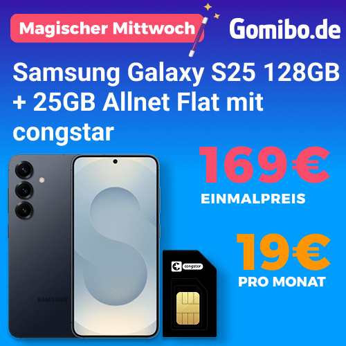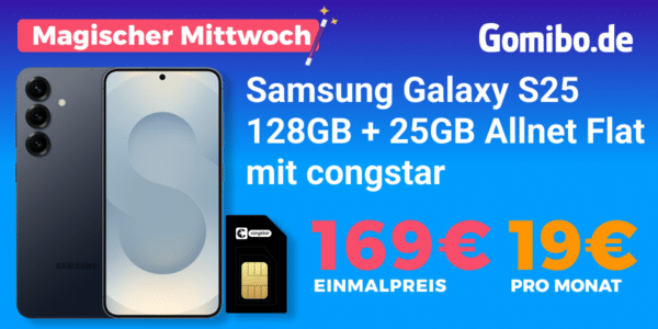 Als Tagesdeal bei Gomibo gibt’s den Congstar-Tarif mit 25GB 5G zu einem Top Preis! Die Grundgebühr beträgt 19€ im Monat und es gibt das Samsung Galaxy S25 mit 128GB für 169€ Zuzahlung als Prämie dazu! Dazu bekommt ihr 10€ für die Mitnahme eurer Rufnummer!