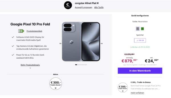 Deinhandy bietet euch das neue Google Pixel 10 Pro Fold in Kombination mit einem Congstar Tarif mit 100GB 5G und Allnet Flat an. Und das nicht mal zu schlechten Konditionen. Einmalig werden 879,95€ für das Pixel fällig und monatlich liegt der Tarif bei 24€. So spart ihr im Tarif knappe 400€ gegenüber dem Kauf des Smartphones!