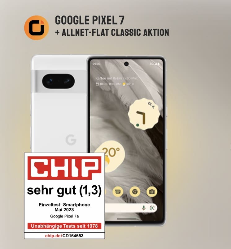 Noch auf der Suche nach einem neuen Vertrag im Vodafone-Netz und dazu einem neuen Google Smartphone als Prämie? Die Otelo Allnet-Flat Classic hat 30GB LTE an Bord und kostet 19,99€ im Monat. Dazu gibts für 49,95 das Google Pixel 7 mit 128GB.