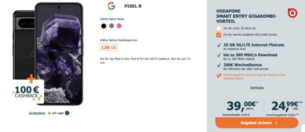 Google Pixel 8 für 39€ mit Vodafone 20GB 5G Flat für 29,99€ mtl. (GigaKombi für 24,99€) + 200€ Bonus 🥳