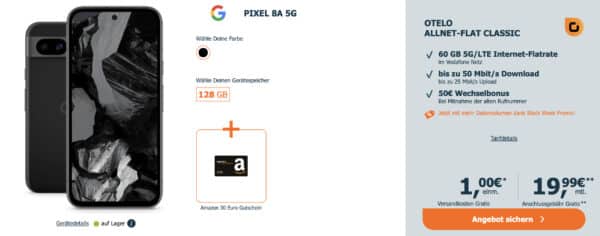 🔥 Google Pixel 8a für 1€ + 30€ Amazon Gutschein mit Vodafone Otelo Allnet mit 60GB 5G/LTE + 50€ Bonus + 0,00€ AG!