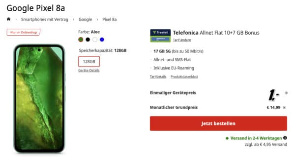 Das Google Pixel 8a bekommt ihr derzeit bei MediaMarkt zusammen mit einem Telefonica-Tarif zu Top-Konditionen: Und zwar zahlt ihr dort derzeit gerade mal 1€ für das Handy und 14,99€ monatlich für die 17GB 5G Flat im o2-Netz.