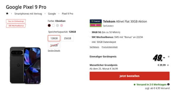 Hier ist ein neuer Deal mit dem Google Pixel 9 Pro: MediaMarkt bietet euch die 30GB 5G Telekom Allnet mit Pixel 9 Pro für 29,99€ monatlich an! Die einmalige Zuzahlung liegt bei 49€. Da das Smartphone an sich im Einzelkauf noch recht teuer ist (749€) lohnt sich der Kauf im Tarif hier auf jeden Fall, da MediaMarkt neben 50€ Bonus für die Rufnummer auch noch die Google Pixel Buds Pro mit ins Paket legt!