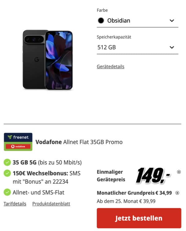 🤯 Google Pixel 9 Pro 512GB für 149€ 📲 Vodafone mit 35GB für 34,99€ mtl. + 150€ Bonus