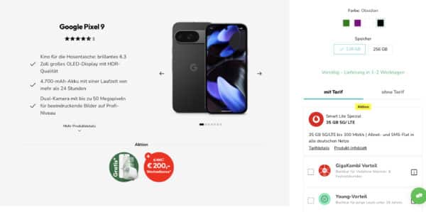 Bei sparhandy gibt es das Google Pixel 9 (128GB) für 9,95€ im Vodafone Smart Lite (35GB im Vodafone Netz 5G und LTE) für 34,99€ mtl., + 200€ Wechselbonus. Das sind effektiv dann unter 2€ pro Monat für respektable Leistungen im Vodafone Netz!