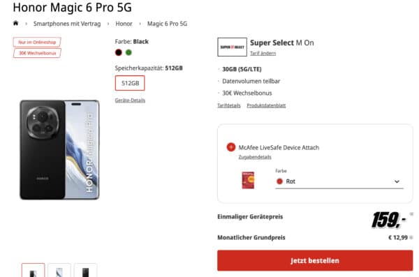 Bei MediaMarkt gibt es aktuell einen sehr interessanten Deal für den hauseigenen o2 Tarif: Mit dem Super Select M bekommt ihr 30GB LTE für 12,99€ im Monat und das Honor Magic 6 Pro für 159€ einmalig dazu! Macht unterm Strich 203€ Ersparnis gegenüber dem Idealo Preisvergleich des Smartphones!