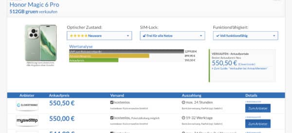 – 678,95€ Honor Magic 6 Pro (lt. Idealo)