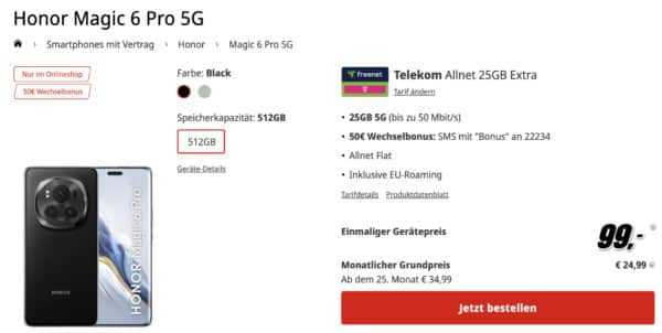 Ihr seid Honor Fans oder wollt einfach mal was neues ausprobieren? Dann gibt es jetzt die Gelegenheit für euch. Bei MediaMarkt bekommt ihr das Honor Magic 6 Pro für einmalig 99€. Dazu gibt es eine 25GB Allnet Flatrate im Telekom Netz für 24,99€ mtl. und sogar nochmal 50€ obendrauf, wenn ihr eure Rufnummer mitnehmt!