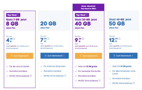 Wer einen Tarif ohne Handy sucht, könnte hier fündig werden: Ihr bekommt die Allnet-Flats von Blau im o2-Netz aktuell zu wirklich niedrigen Grundgebühren. Aktuell sind dank den Winter-Deals auch die ersten 3 Monate bei den Laufzeitvarianten GRATIS!