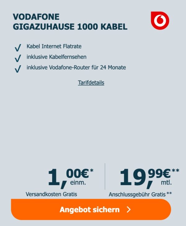 Im Aktionszeitraum (28.05.2024 – 28.09.2025) bietet Vodafone allen Kabel-Neukund:innen bei Abschluss eines GigaZuhause Kabel-Tarifes eine Vodafone-Station 24 Monate lang für 0 € an. Ab dem 25. Monat kostet diese dann wieder 2,99 €/Monat.