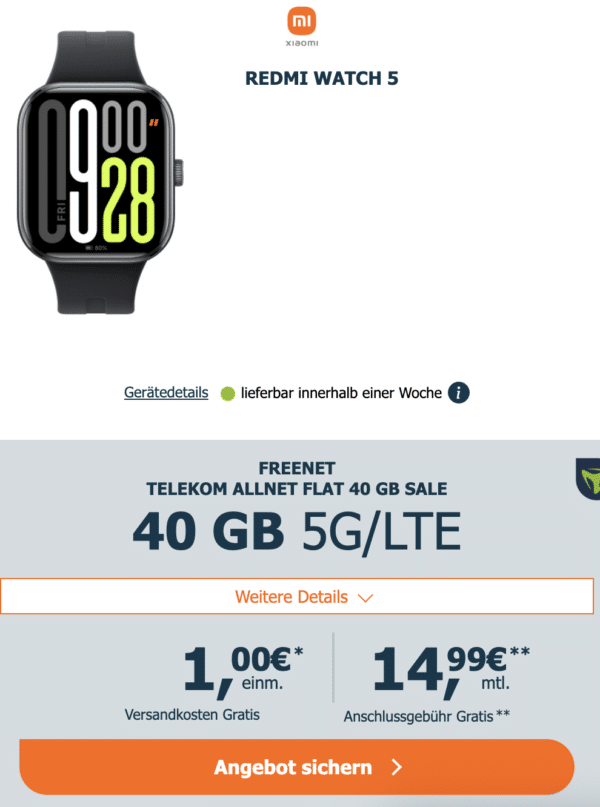 Noch auf der Suche nach einem neuen Vertrag im Telekom-Netz und dazu neue Kopfhörer als Prämie? Die Freenet Telekom Allnet-Flat hat 40GB 5G/LTE an Bord und kostet nur 14,99€ im Monat. Dazu gibt’s die Xiaomi Redmi Watch 5 für nur 1€ und einen fetten 150€ Wechselbonus*** für die Rufnummer sowie 96€ Guthaben** von Logitel. Den Anschlusspreis gibt es über die App erstattet*!