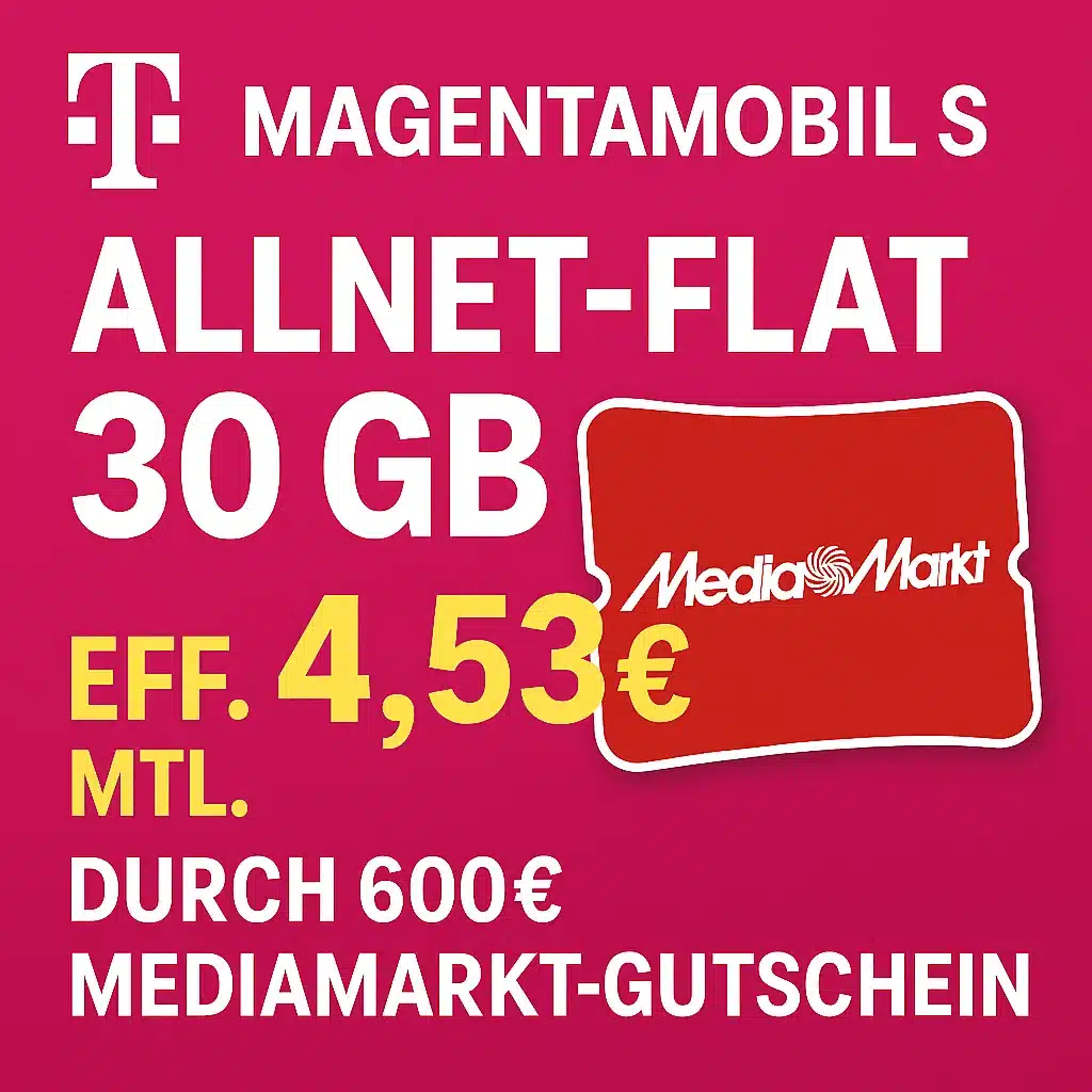 💥 [Eff. 4,53€ mtl.] 30GB 5G TELEKOM Allnet für 29,95€ mtl. 😮 + 600€ MediaMarkt-Gutschein + 50€ Bonus