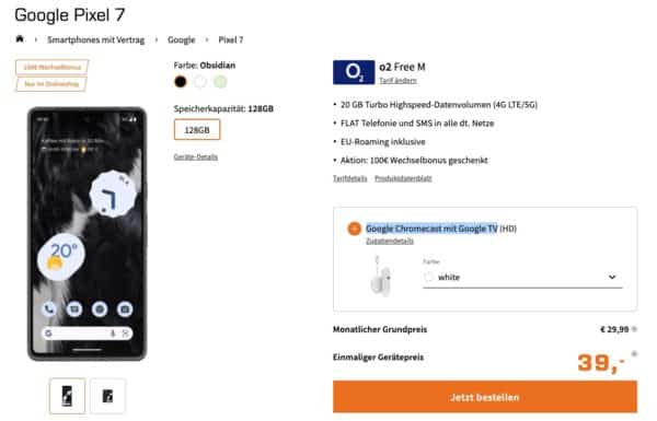 Nur 2,03€ mtl. eff. 🔥 Google Pixel 7 + Google Chromecast mit Google TV mit o2 Free M (20GB 5G) & 100€ RNP Bonus!