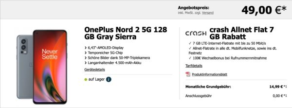 Momentan bekommt ihr eine 7GB Vodafone LTE Allnet-Flat von Crash für gerade mal 14,99€ im Monat. On top gibt es das OnePlus Nord 2 für eine einmalige Zuzahlung von gerade mal 49€. On top gibt es noch einen fetten 100€ Bonus für die Rufnummermitnahme. Schaut euch die Details an.