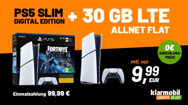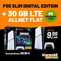 Falls ihr ein Auge auf die Sony PlayStation 5 geworfen habt: Bei Klarmobil gibt es nur für kurze Zeit die Klarmobil Allnet-Flat mit 30GB LTE für unter 10€ im Monat und die Sony PlayStation 5 Slim Digital als Fortnite Cobalt Star Bundle für 99,99€ dazu. Zumindest wenn der Effektivpreis entsprechend niedrig ausfallen soll, macht ihr bei humaner Zuzahlung einen sehr guten Deal:- Allnet-Flat in alle Netze