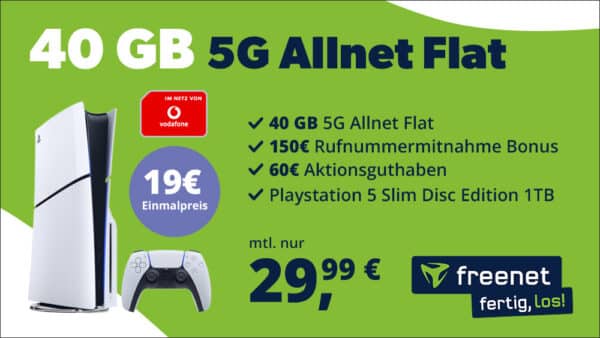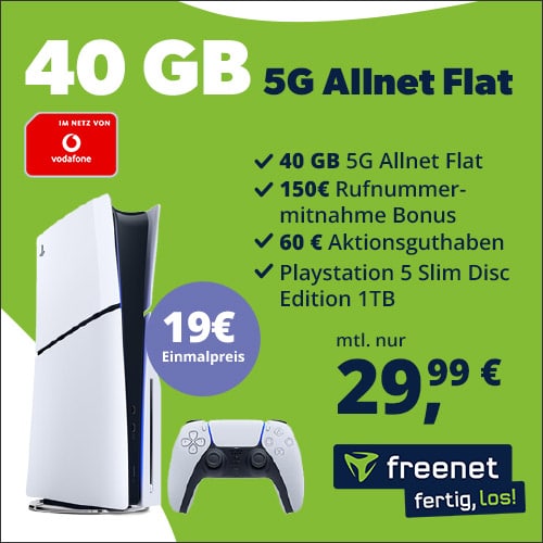 Freenet liefert grade den nächsten Vodafone Deal: Ihr bekommt die Playstation 5 Slim für einmalig 19€ inkl. Versand mit einer 40B LTE/5G Allnet-Flat für 29,99€ im Monat. Dann ergibt sich eine effektive Rate nach Idealo von 0,78€ pro Monat dank 60€ Aktionsguthaben und 150€ Bonus für eure Rufnummer!