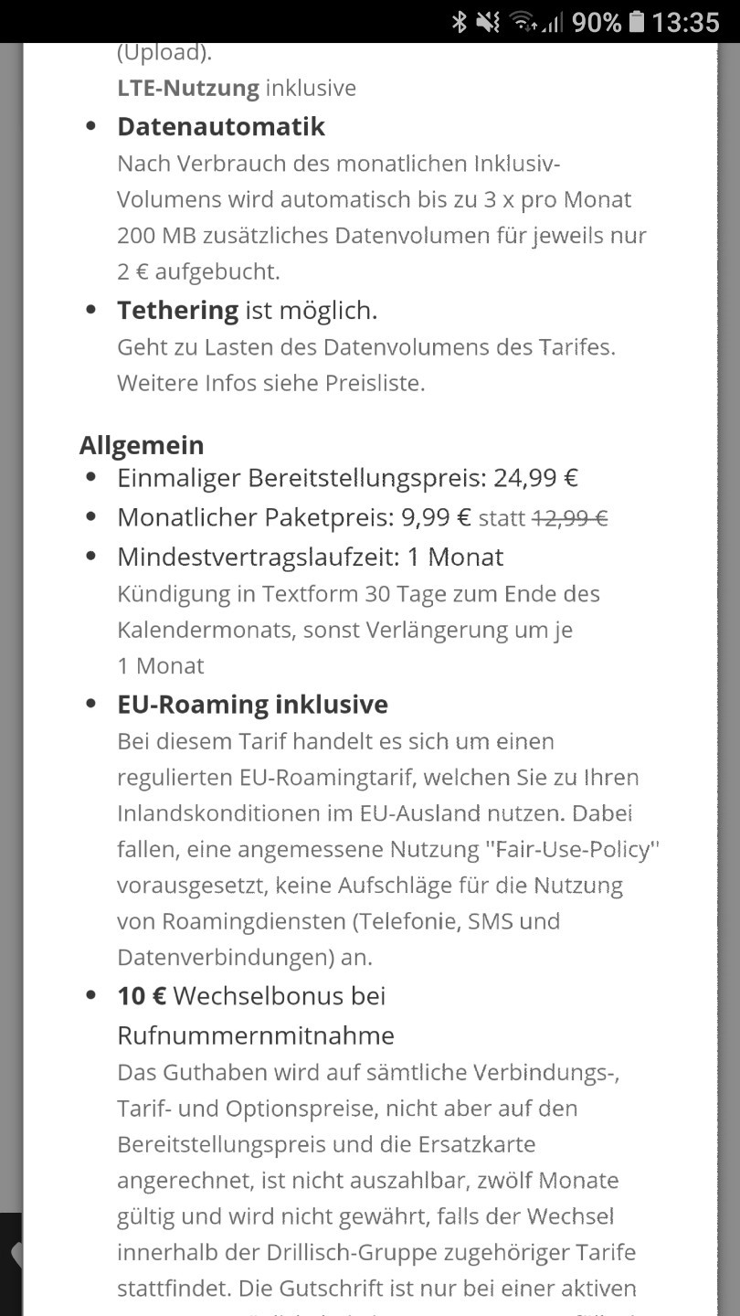 Navarre61 11.08.2018, 08:36Meinen alten 3GB-Vertrag beim PremiumSIM online gekündigt, dort angerufen und den 4GB-Vertrag ohne Bereitstellungsgebühr (24,95 €) und mit monatlicher Kündigungsfrist erhalten. Perfekt!