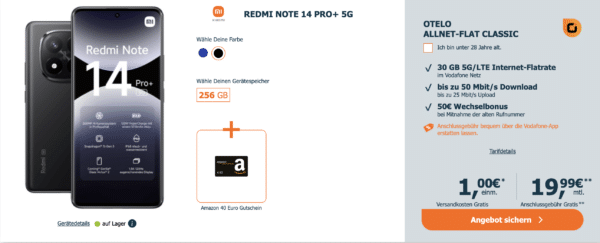 📱 Redmi Note 14 Pro+ 5G + 30GB OTELO Allnet-Flat für 19,99€ mtl. (+ 40€ Amazon-Gutschein)