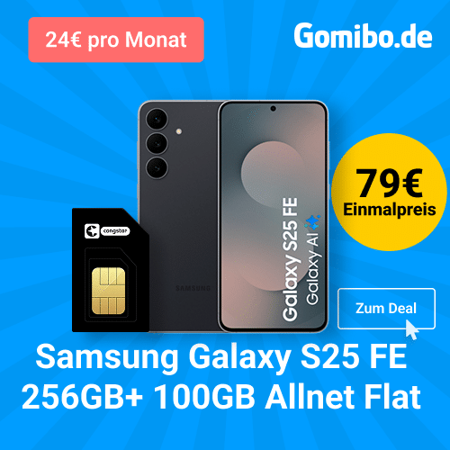 Bei Gomibo gibt es einen guten Deal für das Samsung Galaxy S25 FE! Ihr könnt das Smartphone in Dunkelblau mit 128GB Speicher für nur 19€ einmalig oder mit 256GB für 79€ einmalig bekommen, zusammen mit dem Congstar Telekom-Tarif, der euch satte 100GB Datenvolumen für 24€ mtl. beschert. Zudem gibt es 10€ Bonus wenn ihr eure Rufnummer mitnehmt.