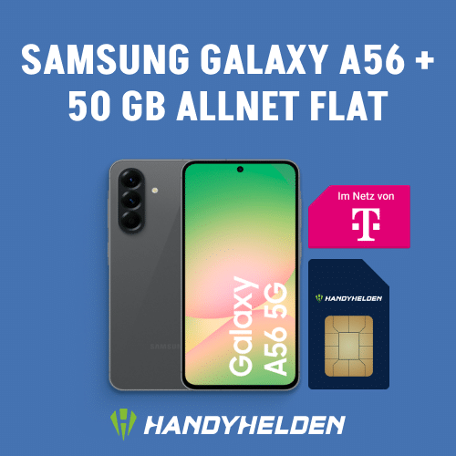 Jetzt gibt es einen etwas nischigen Deal mit dem Samsung Galaxy A56 und passendem Tarif. Ihr bekommt aktuell bei Handyhelden nämlich das Handy für 29€ Zuzahlung und dazu einen 50GB 5G Telekom Allnet-Flat Tarif für 19,99€ monatlich via freenet-.