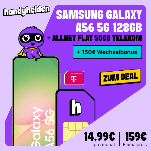 [Eff. 0,58€] Samsung Galaxy A56 256GB für 119€ mit 50GB 5G Telekom Allnet für 14,99€ mtl. + 150€ Bonus