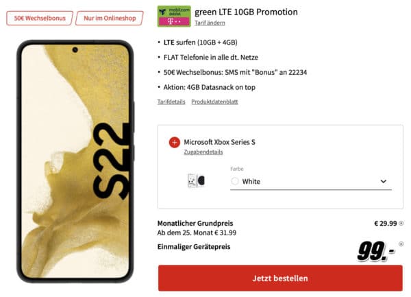 Hier ist ein Deal mit dem Galaxy S22: Saturn bietet euch die 14GB LTE md Telekom Allnet mit iPhone für 29,99€ monatlich an! Die einmalige Zuzahlung liegt bei 99€ für das 128GB Enterprise Edition Modell samt Xbox Series S. Das macht unterm Strich fette 142,25€ Ersparnis und einen effektiv kostenlosen Tarif mit einer 14GB Flat im Telekom-Netz! Hier die Tarifdetails: