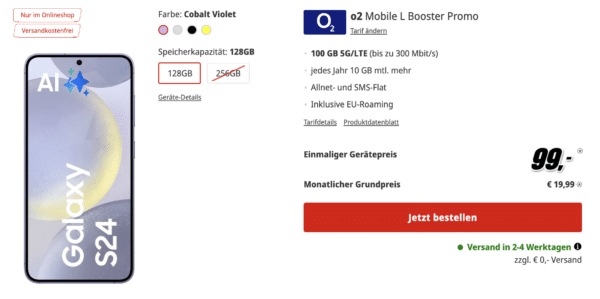 Samsung Galaxy S24 📱 für 99€ im o2 Mobile Unlimited on Demand (Booster Promo) mit 100GB LTE (inkl. 5G/LTE) für 24,99€ mtl.
