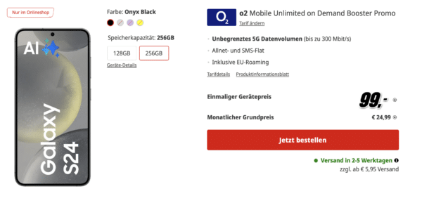 Samsung Galaxy S24 📱 für 99€ im o2 Mobile Unlimited on Demand (Booster Promo) mit 100GB LTE (inkl. 5G/LTE) für 24,99€ mtl.
