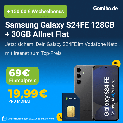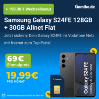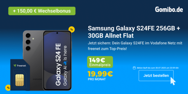 Bei Gomibo könnt ihr euch gerade das Samsung Galaxy S24 FE mit 256GB und mit einer 30GB 5G Vodafone Allnet-Flat sichern. Für das Smartphone zahlt ihr einmalig 149€ und die monatlichen Kosten belaufen sich auf 19,99€. Für 128GB zahlt ihr sogar nur 69€ Zuzahlung! Wem das reicht macht hier den noch besseren Deal!