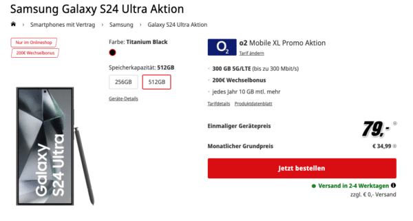 Hier haut nun MediaMarkt einen Deal zum S24 Ultra raus: Das Samsung Galaxy S24 Ultra mit 256GB für 79€ – im o2 Mobile XL (300GB, 5G und LTE) für 34,99€ mtl. + 200€ Wechselbonus. Ihr erhaltet sogar jährlich 10GB obendrauf! Der Tarif kostet für euch unterm Strich effektiv nichts!