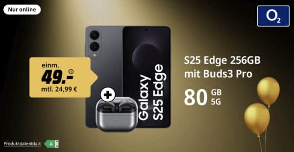 Falls das Vodafone-Netz nichts für euch ist, gibt es den Deal auch im o2-Netz zum selben Preispunkt, hier habt ihr dann allerdings 80GB pro Monat und das S25 mit „nur“ 256GB!