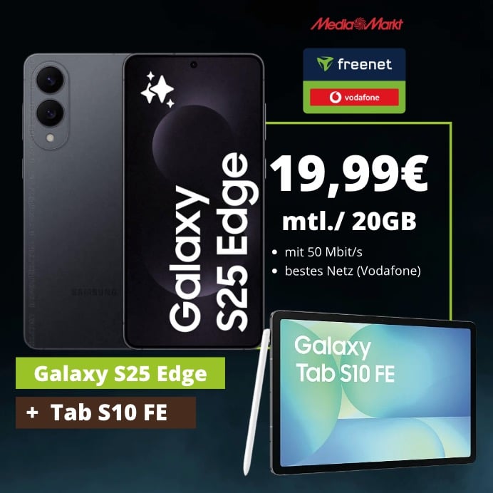 MediaMarkt hat gerade ein krankes Angebot für euch am Start: Ihr bekommt die freenet Flat im Vodafone Netz mit 20GB 5G für 19,99€ monatlich und dazu das Samsung Galaxy S25 Edge (256GB) für 79€. Zudem gibt es aktuell zu jedem S25 FE das Samsung Galaxy Tab S10 FE (Wert: 379€) geschenkt!Tipp Trade In? Solltet ihr ein altes Gerät zum Einsenden haben, gibt es nochmal 75€ Sofort-Bonus + den Gerätewert! Dann seid ihr bei nur noch 4€ Zuzahlung! Das wären saftige 423€ ERSPARNIS!