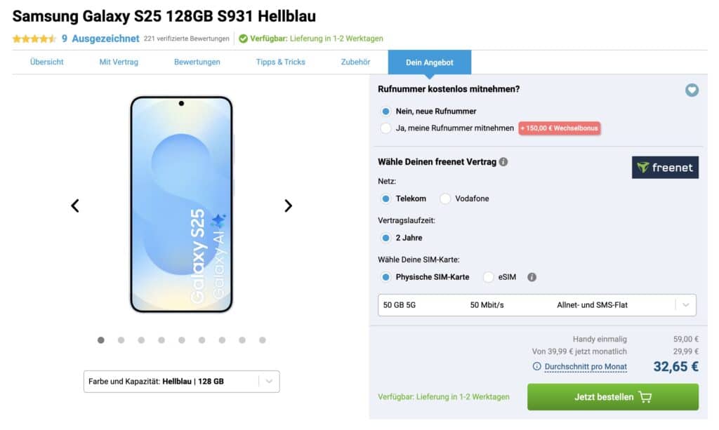 Samsung Galaxy S25 📱 59€ (o. 256GB 129€) mit 50GB 5G Telekom Allnet für 29,99€ mtl. (mit 150€ Bonus)