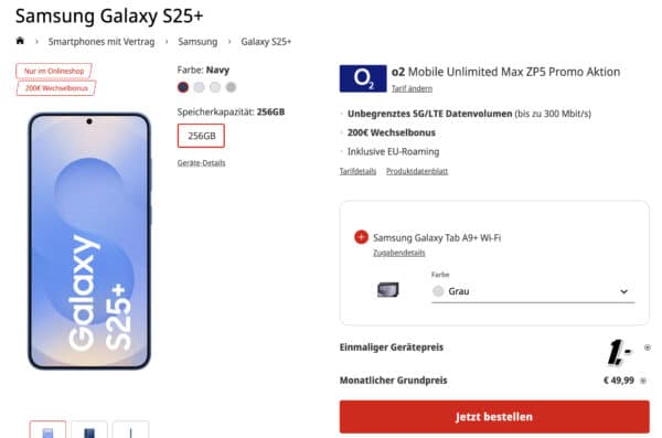 Das S25 Plus mit 256GB bekommt ihr im selben Tarif ebenfalls mit dem Tablet als Zugabe für 1€ und 49,99€ pro Monat – hier gibt es aber satte 200€ Wechselbonus – weshalb dieser Tarif ebenfalls rechnerisch kostenlos wäre da ihr bei 1.045,70€ Gesamtkosten Hardware im Wert von 1.061€ bekommt!