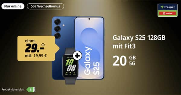 [Vorbei][TOP] 🔥 Galaxy S25 + Fit3 Fitnesstracker für 29€ mit 20GB Vodafone 5G für 19,99€ mtl. + 50€ Bonus | Auch Telekom oder o2!