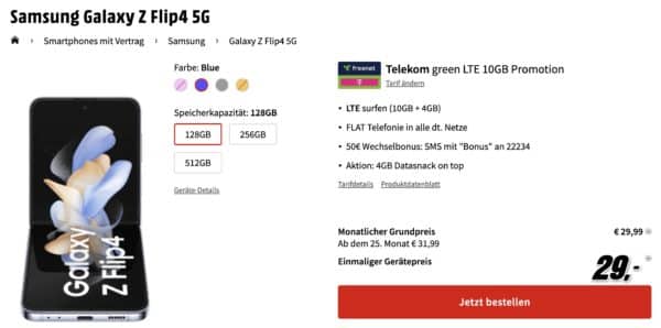 Hier ist ein Deal mit dem Klapp-Phone Galaxy Z Flip 4: MediaMarkt bietet euch die 14GB LTE freenet Telekom Allnet mit Galaxy Z Flip 4 für 29,99€ monatlich an! Die einmalige Zuzahlung liegt bei nur 29€. Das macht unterm Strich eff. 3,95€ mtl. für eine 14GB Flat im Telekom-Netz! Hier die Tarifdetails: