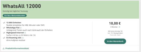 [Mit 15€ Startguthaben] WhatsApp SIM: 12.000 Einheiten flexibel einsetzbar für Daten, Minuten oder SMS für 10€ / 4 Wochen (Prepaid)