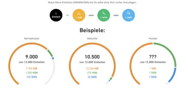 - 12.000 flexible Einheiten pro Monat für Minuten, SMS oder MB