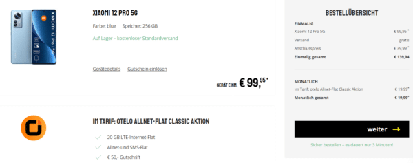 Ihr steht auf Tarifschnäppchen, seid mit 20GB Datenvolumen zufrieden und wollt ein Xiaomi Smartphone? Vielleicht ist der Otelo Allnet-Flat Classic etwas für euch? Dieser hat 20GB LTE an Bord und kostet nur 19,99€ im Monat. Sparhandy nutzt das, um mit einem lukrativen Deal zu locken – und zwar mit dem Xiaomi 12 Pro (256GB) im Wert von 623€ für 99,95€ Zuzahlung!