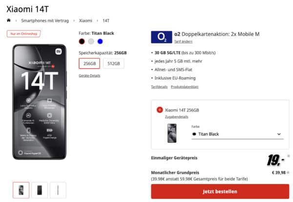 Hier haut MediaMarkt einen weiteren krassen Deal zum Xiaomi 14T raus: 2x das Xiaomi 14T mit 256GB für insgesamt 19€ – inklusive 2x Mobile M mit je 30GB für nur 39,98€ mtl. Insgesamt liegen wir hier bei effektiv 7,12€ mtl. / 3,56€ pro Tarif!