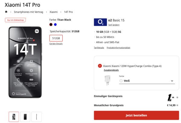 Eff. gratis!📱Xiaomi 14T Pro 512GB + 120W HyperCharge für 1€ + 10GB 5G Allnet o2 für 14,99€ mtl. (+ 50€ Bonus)