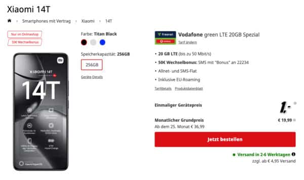 Eff. GRATIS! 🤯 Xiaomi 14T + Xiaomi Staubsauger G20 für 1€ mit 20GB Vodafone LTE & Allnet für 19,99€ mtl.