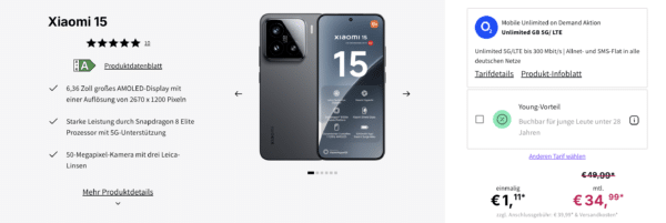 Das Xiaomi 15 könnt ihr gerade mit einem interessanten Deal bei DeinHandy abstauben.Ihr kriegt das Smartphone mit 512GB internem Speicher für einmalig 1,11€ und dazu gibt es unbegrenztes 5G/LTE Datenvolumen mit Allnet Flat im o2 Netz für 34,99€ mtl.