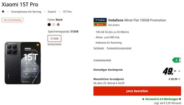 Xiaomi 15T Pro für 49€ + 100GB 5G Vodafone für 29,99€ mtl.
