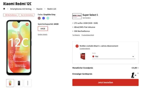Bei MediaMarkt gibt es einen Deal für den hauseigenen o2 Tarif: Mit dem Super Select S bekommt ihr aktionsweise 10GB LTE (statt 5GB) für 9,99€ im Monat und das Xiaomi Redmi 12C für 1€ einmalig dazu!