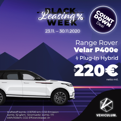 Zur Vehiculum Black Leasing Week gibt es ein Countdown Deal für Gewerbe-Kunden: den Range Rover Velar. Ab nur 220€ monatlich netto könnt ihr zuschlagen, wenn ihr euch mit 10.000km Laufleistung im Jahr arrangieren könnt. Die Laufzeit des Leasings beträgt 36 Monate, ist allerdings wie die jährlichen Kilometer anpassbar. On Top kommen nochmal 16,30€ pro Monat für das Service Paket, welches dazu gebucht werden muss!